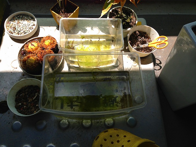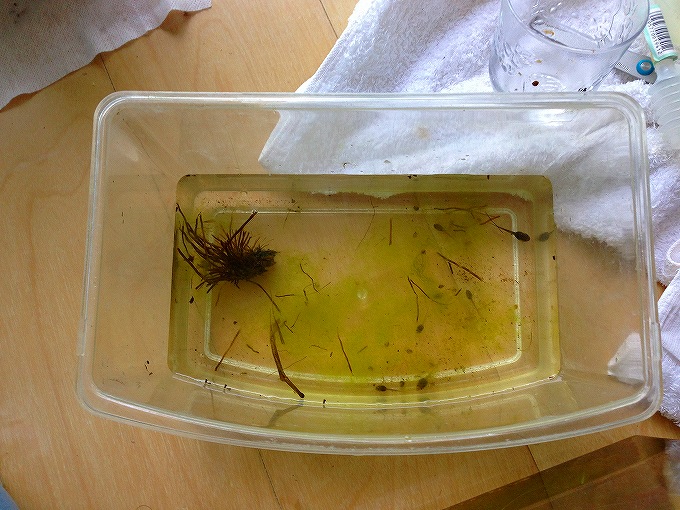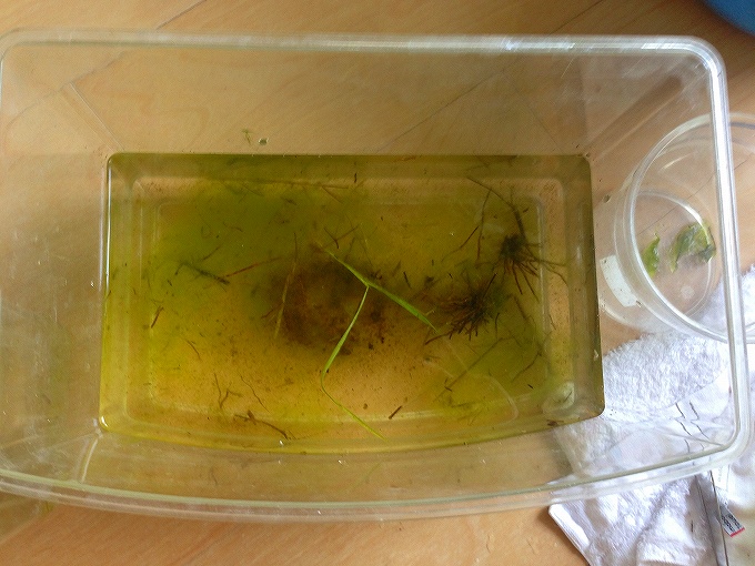 田んぼの水と汲み置きの水をケージに追加。こんな感じ。
