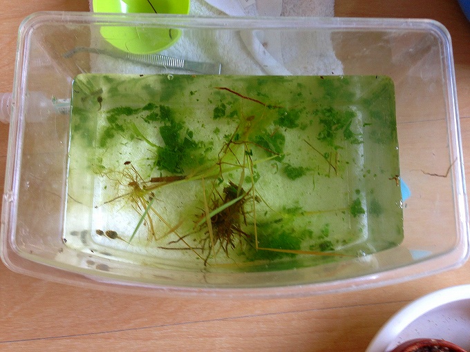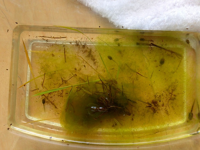取り置きの田んぼの水の底部分をスポイトで吸い取ってケージに追加。