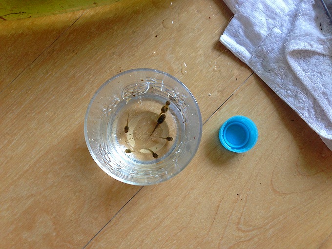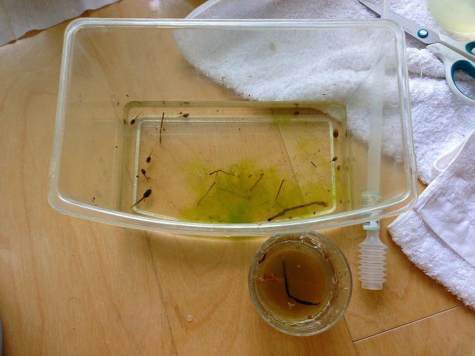 朝、だいぶケージの底が汚れている。おたまじゃくしの糞だろうか。