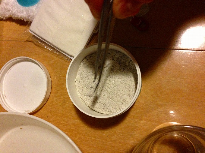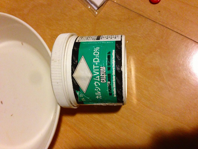 カルシウムをまぶしてエサやり。