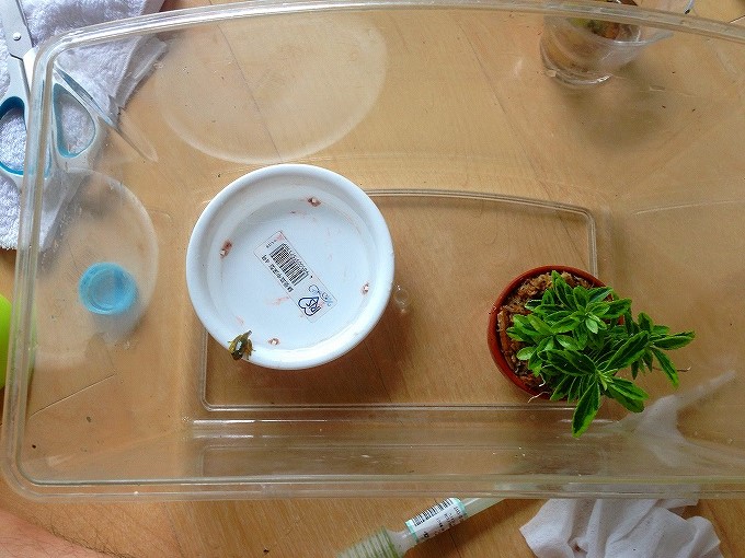 水換え、エサやり(ほうれんそう、しらす、乾燥糸ミミズ)
